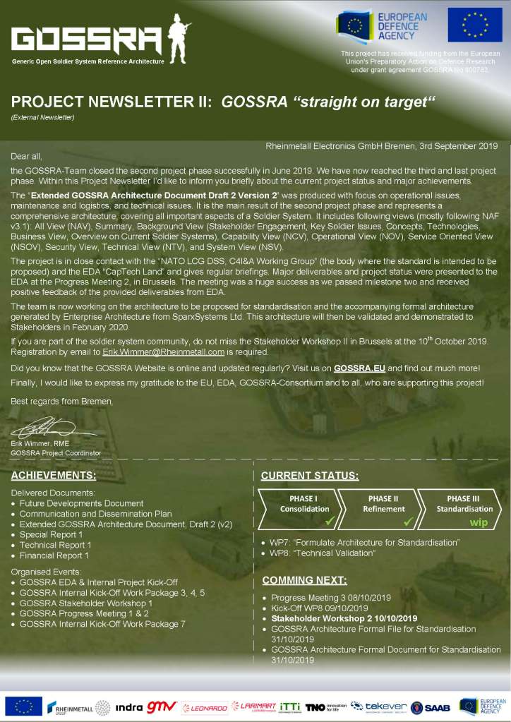 The “Extended GOSSRA Architecture Document Draft 2 Version 2” was produced with focus on operational issues, maintenance and logistics, and technical issues. It is the main result of the second project phase and represents a comprehensive architecture, covering all important aspects of a Soldier System. It includes following views (mostly following NAF v3.1): All View (NAV), Summary, Background View (Stakeholder Engagement, Key Soldier Issues, Concepts, Technologies, Business View, Overview on Current Soldier Systems), Capability View (NCV), Operational View (NOV), Service Oriented View (NSOV), Security View, Technical View (NTV), and System View (NSV).